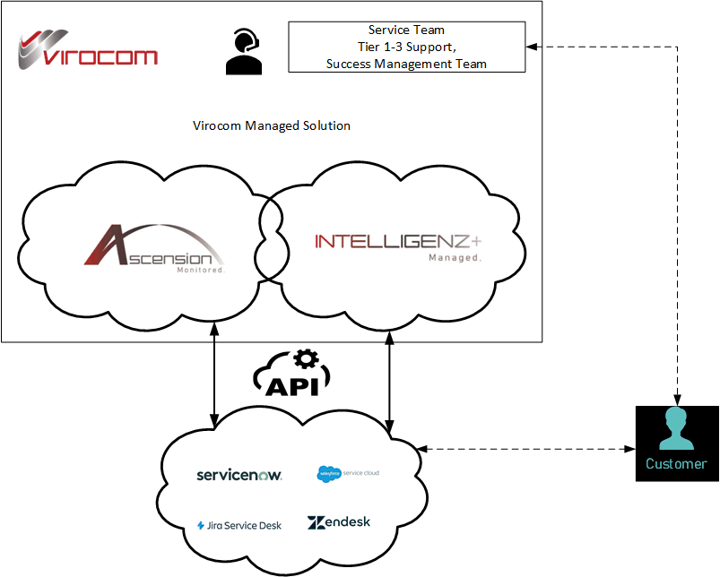 Although we believe a fully managed service from Virocom is the best solution, we understand for some companies a hybrid solution may be for effective. With this in mind Virocom have built Ascension and Intelligenz+ to take in consideration bi-lateral integration with third party ITSM platforms.